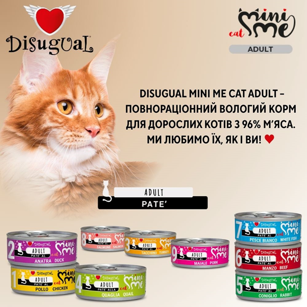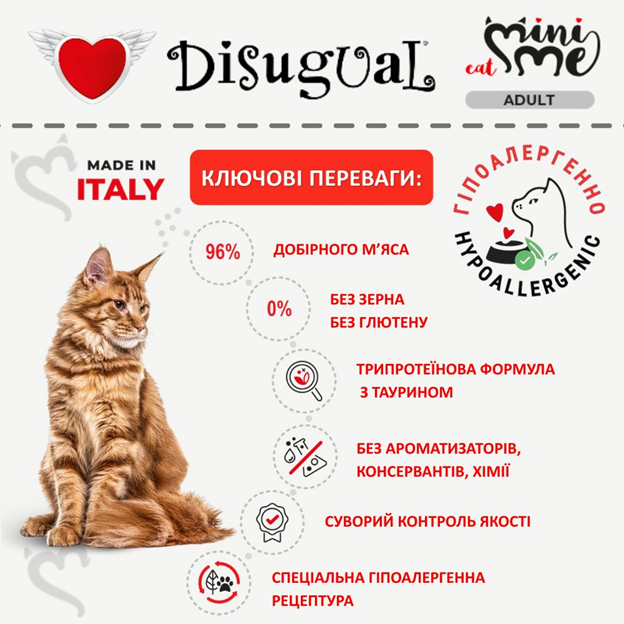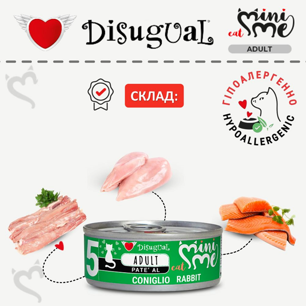 Спеціальна італійська рецептура протеїнового корму для котів Disugual Mini Me Cat 96% Protein Rabbit без глютену та зерна на основі трьох видів добірного м’яса з вітамінно-мінеральним комплексом, таурином та природнім пребіотиком ідеально підходить як повнораційний корм для котів з харчовою непереносимістю, харчовою алергією у котів, непереносимістю глютену у котів, ожиріння у котів, активних та вибагливих котів.