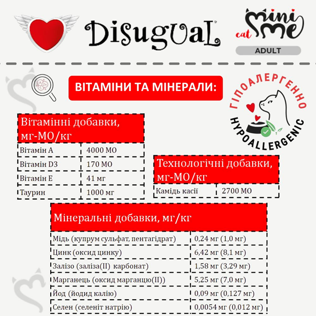 Протеїн – трипротеїновий корм для котів Disugual Mini Me Cat 96% Protein Rabbit містить три джерела високоякісного білку тваринного походження: добірне м’ясо кролика-27%, курки та лосося. Кролик - дієтичне гіпоалергенне м’ясо з низьким вмістом жиру, що легко засвоюється та підходить для котів з чутливим травленням. Кролик збагачений є джерелом вітамінів А, D, E та мінералів кальцій, фосфор та магній, що необхідні для здорової шкіри та шерсті, опорно-рухового апарату кота, зору та нервової системи. Дієтична курка забезпечує організм кота легкозасвоюваним білком та надає енергійності, а лосось – незамінний постачальник Омега-3, йоду та вітаміну D, що забезпечує здоров’я мозку та серця кота.