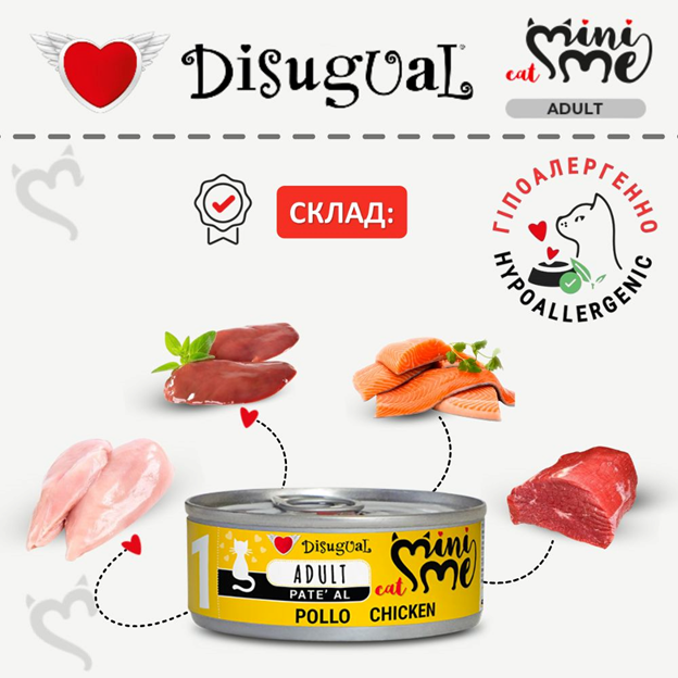 Disugual Mini Me Cat 96% Protein Chicken Безглютеновий консервований беззерновий корм для котів Паштет з Курки – це високоякісний натуральний вологий безглютеновий корм для котів класу холістик від італійського бренду Disugual, відомого виробника високоякісного натурального харчування для собак та котів без додавання штучних ароматизаторів, консервантів та інших хімічних речовин.