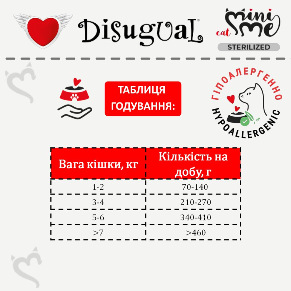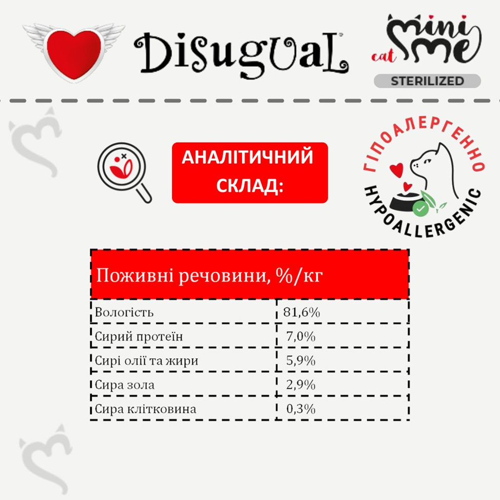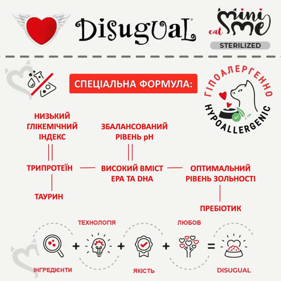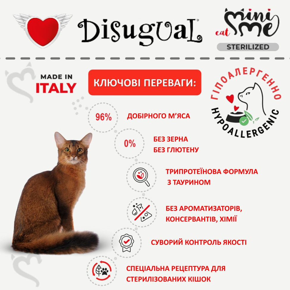 Спеціальна італійська рецептура протеїнового корму для стерилізованих кішок та кастрованих котів Disugual Mini Me Sterilised Cat 96% Protein White Fish без глютену та зерна на основі трьох видів добірного м’яса з вітамінно-мінеральним комплексом, таурином та природнім пребіотиком ідеально підходить як повнораційний корм для стерилізованих кішок та кастрованих котів з харчовою непереносимістю, харчовою алергією у котів, непереносимістю глютену у котів, ожиріння у котів, активних та вибагливих котів.