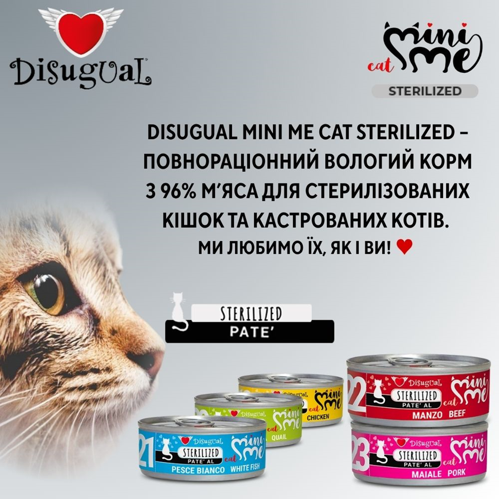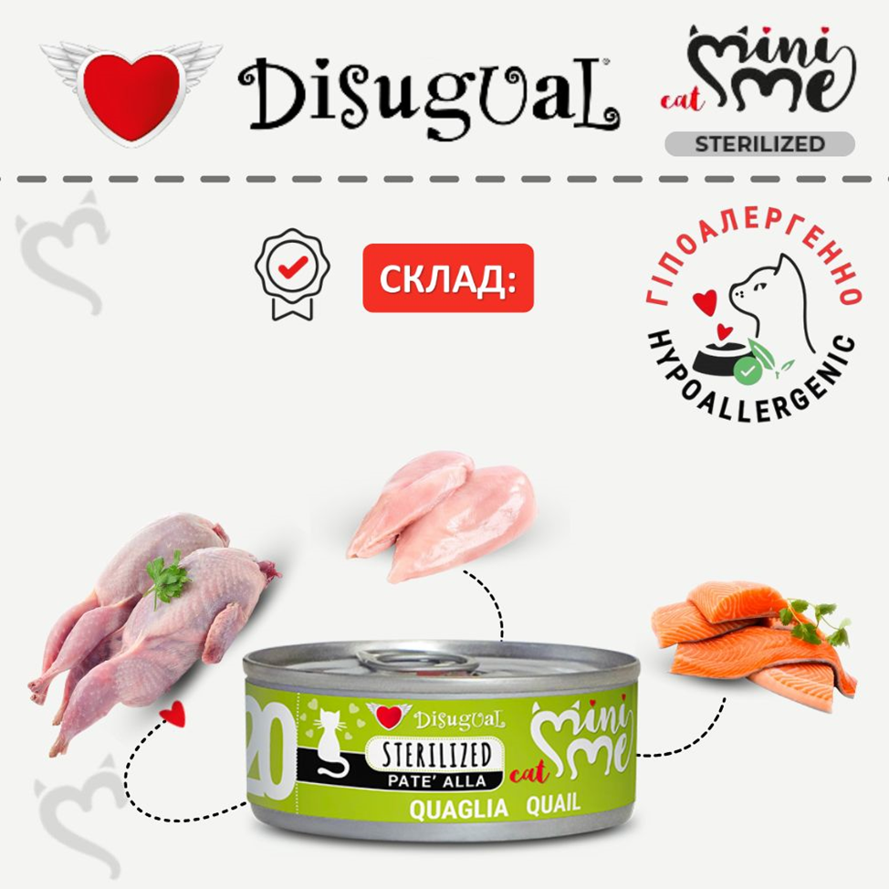 Disugual Mini Me Sterilised Cat 96% Protein Quail Беззерновий консервований корм для стерилізованих котів Паштет з Перепілки– це високоякісний натуральний вологий безглютеновий корм для стерилізованих кішок та кастрованих котів класу холістик від італійського бренду Disugual, відомого виробника високоякісного натурального харчування для собак та котів без додавання штучних ароматизаторів, консервантів та інших хімічних речовин.