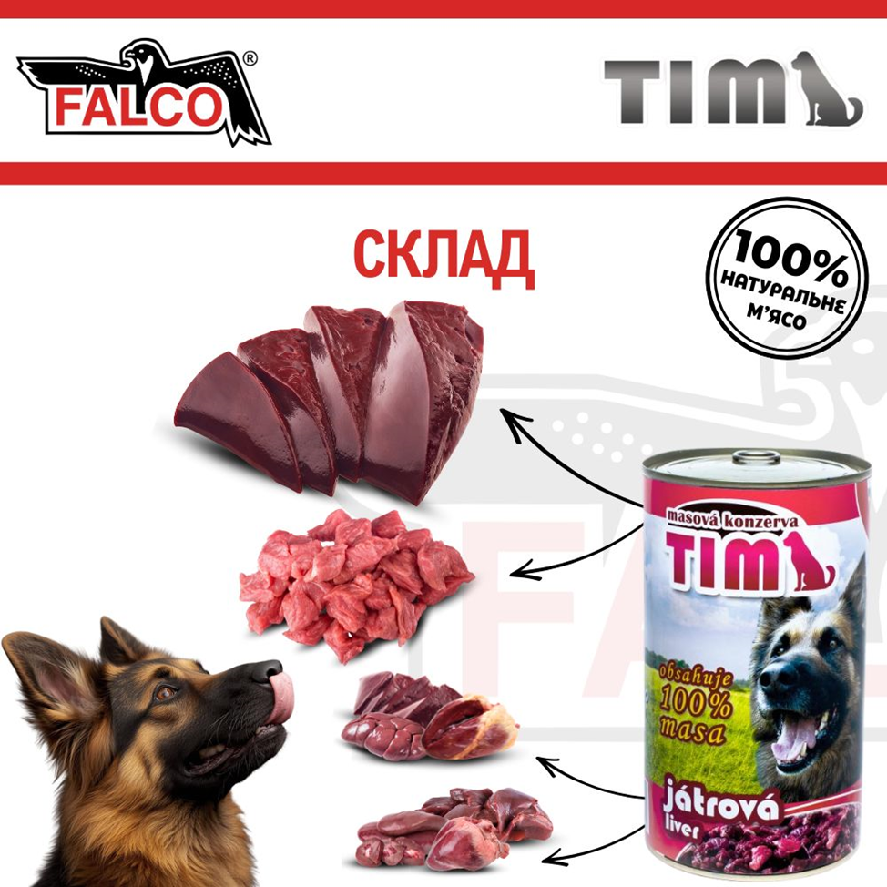 Ключові переваги консервованого м'яса для собак Асорті з Яловичини та Печінки FALCO TIM Dog 100% Meat Liver: