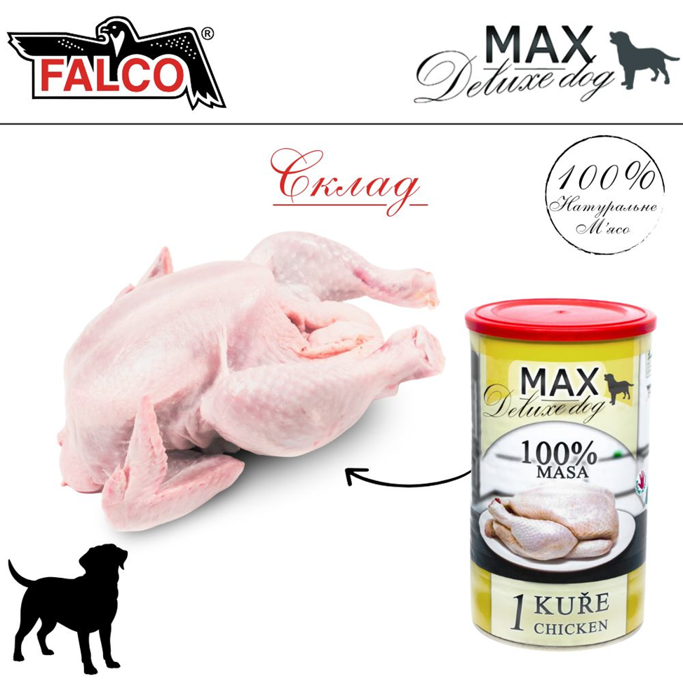 Ключові переваги консервованого м'яса для собак Шматки Курки FALCO MAX Deluxe Dog 100% Meat 1 Chicken: