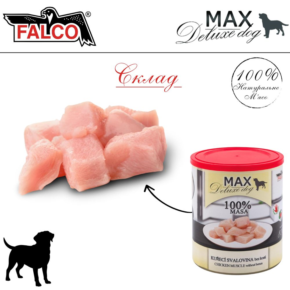 Ключові переваги консервованого м'яса для собак М'ясо Курки без кісток FALCO MAX Deluxe Dog 100% Meat Chicken Muscle: