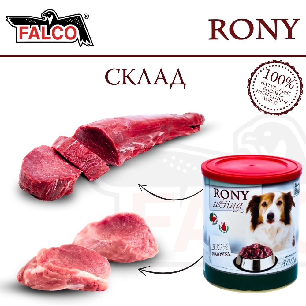 Ключові переваги консервованого м'яса для собак з високою енергетичною цінністю Оленіна FALCO RONY Dog 100% Meat Venison: