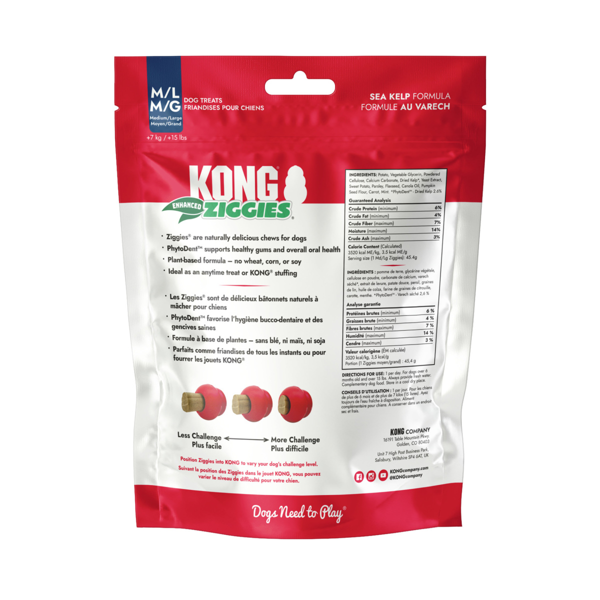 Ласощі збагачені морськими водоростями PhytoDent™, що містять природні антиоксиданти, вітаміни, мінерали та білки. Завдяки щільній жувальній текстурі вони допомагають механічно очищати зуби. KONG Ziggies Enhanced можна давати як окреме частування або використовувати для наповнення іграшок KONG та KONG Tires, роблячи гру довшою та цікавішою. Формула рослинного походження не містить пшениці, кукурудзи та сої, тому підходить для собак із чутливістю до цих інгредієнтів.