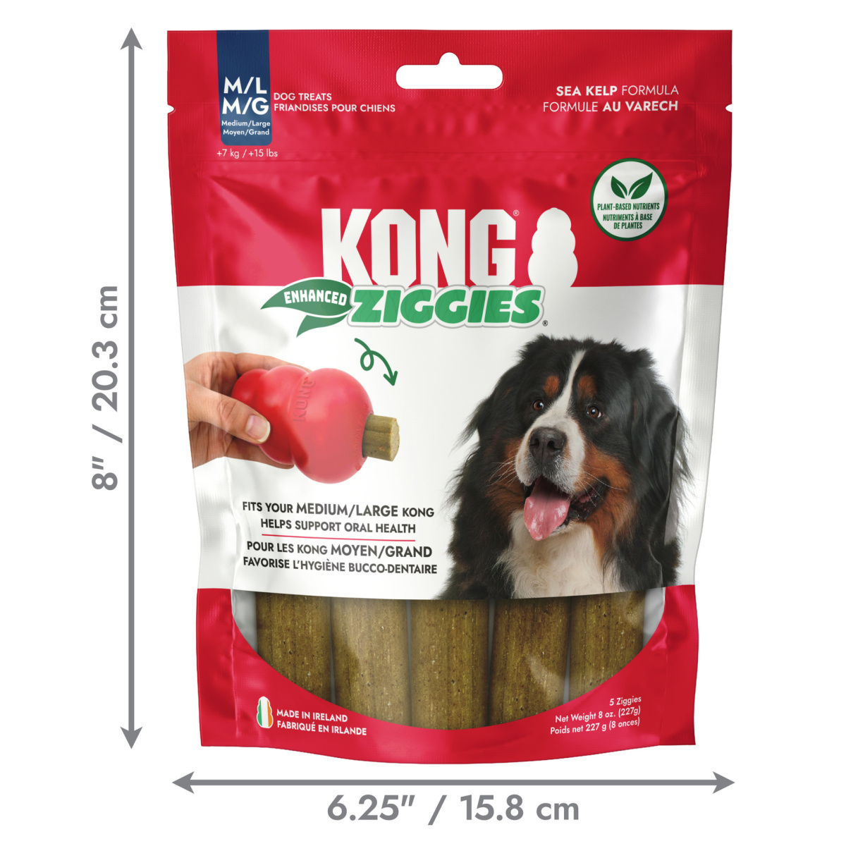 KONG Ziggies Enhanced - це натуральні жувальні ласощі для собак, які допомагають підтримувати здоров’я ротової порожнини. Під час жування вони сприяють зменшенню зубного нальоту, масажують ясна та допомагають підтримувати свіже дихання, водночас задовольняючи природну потребу собаки гризти.