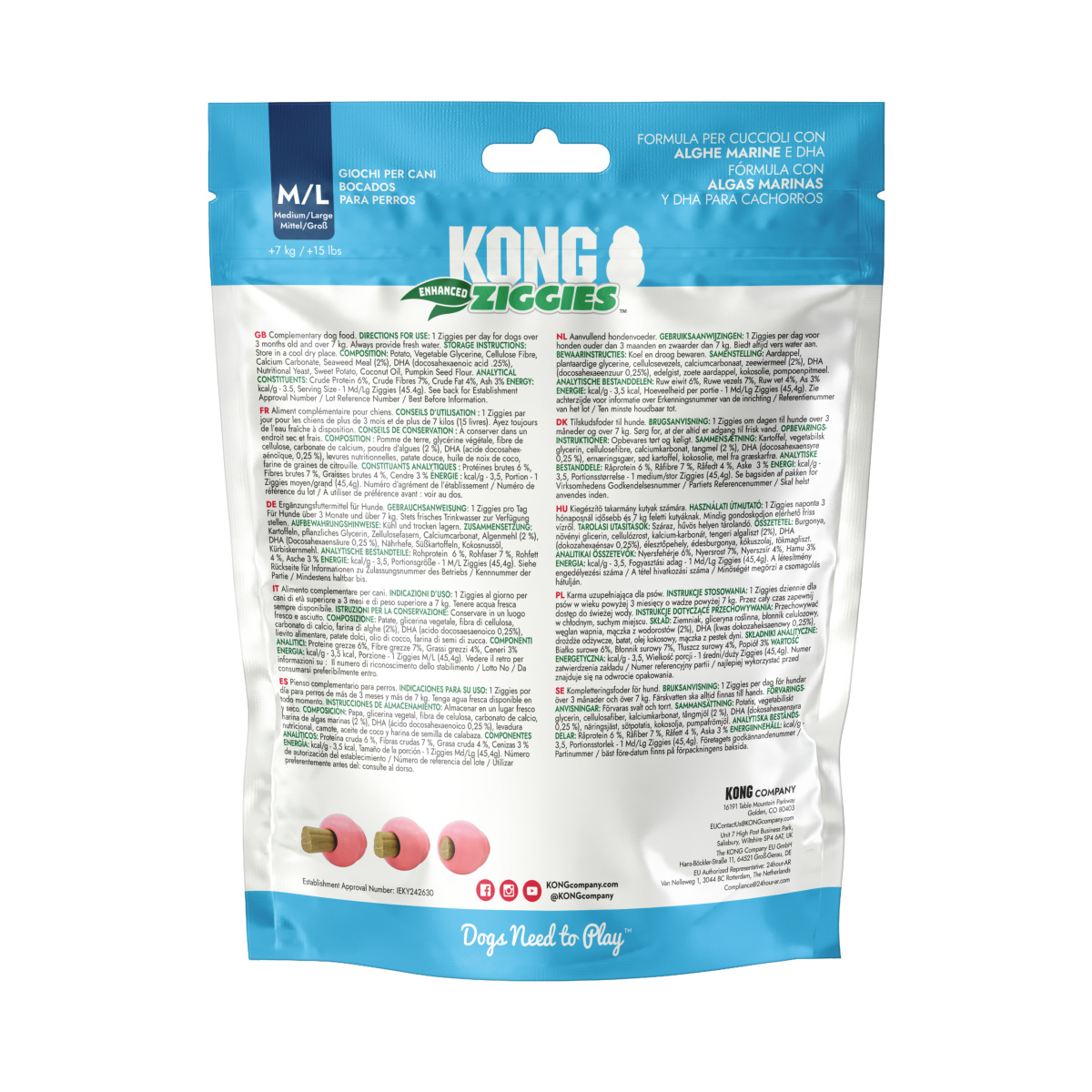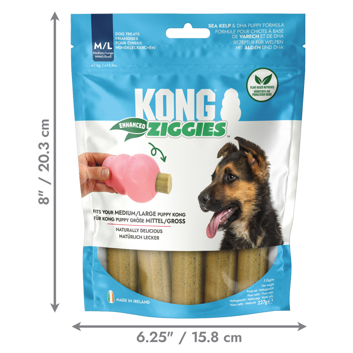 KONG Ziggies Enhanced Puppy - це натуральні ласощі для цуценят, які одночасно підтримують здоров’я ротової порожнини та полегшують прорізування зубів. Ці рослинні жувальні палички містять морські водорості та збагачені DHA, формою омега-3 жирних кислот, які сприяють здоровому розвитку мозку. М’яка текстура легко сприймається шлунком цуценяти, а спеціальні зубні канавки масажують ясна та допомагають видаляти зубний наліт, сприяючи свіжості дихання через механічний ефект жування.
