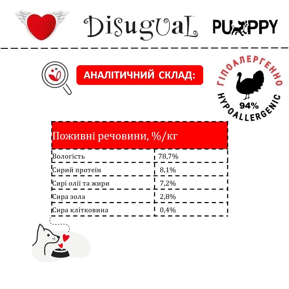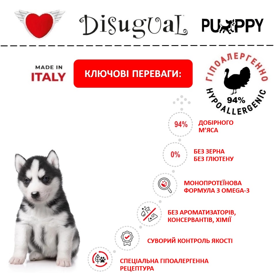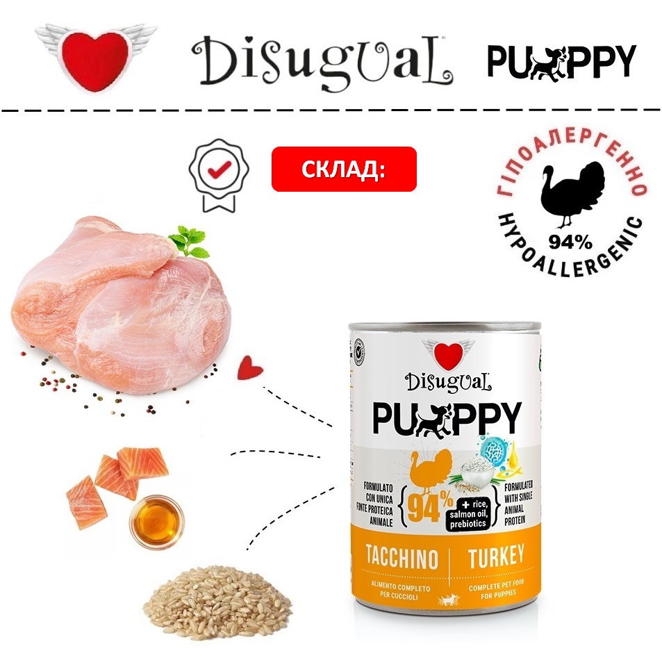 Ключові переваги вологого безглютенового монопротеїнового корму холістик для цуценят Disugual Puppy MonoProtein 94% Turkey: