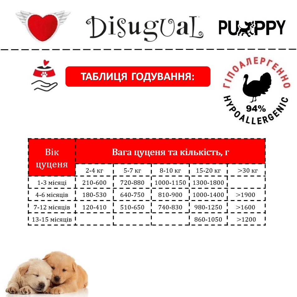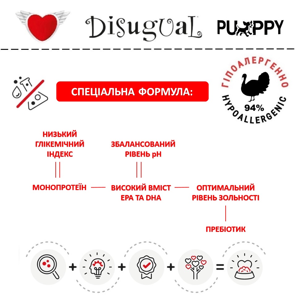Спеціальна італійська рецептура монопротеїнового корму для цуценят Disugual Puppy MonoProtein 94% Turkey без глютену та зерна на основі добірної індички з вітамінно-мінеральним комплексом та пребіотиками ідеально підходить як повнораційний корм для цуценят з харчовою непереносимістю, харчовою алергією у цуценят, непереносимістю глютену у цуценят, целіакією у цуценят.