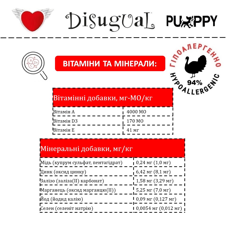 Склад беззернового гіпоалергенного корму для цуценят Disugual Puppy MonoProtein 94% Turkey: індичка 94%, рис, лососева олія, мінеральні речовини, ксилоза, FOS, MOS.