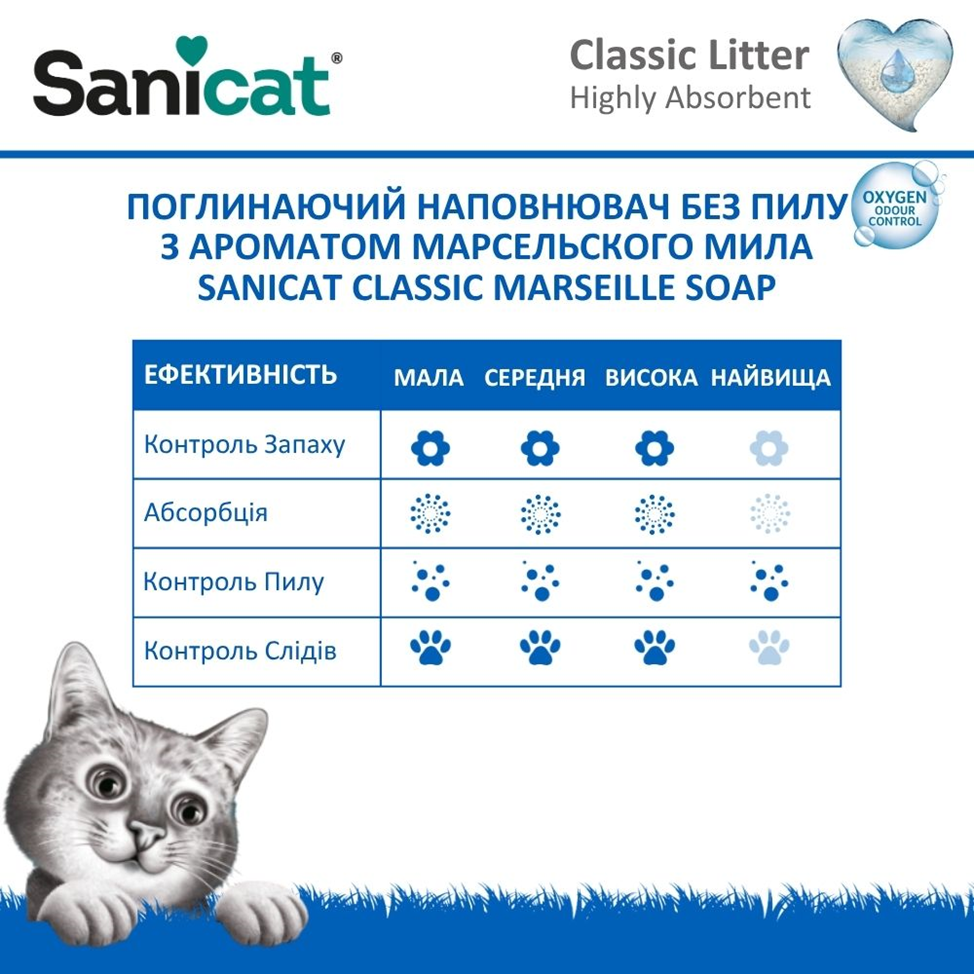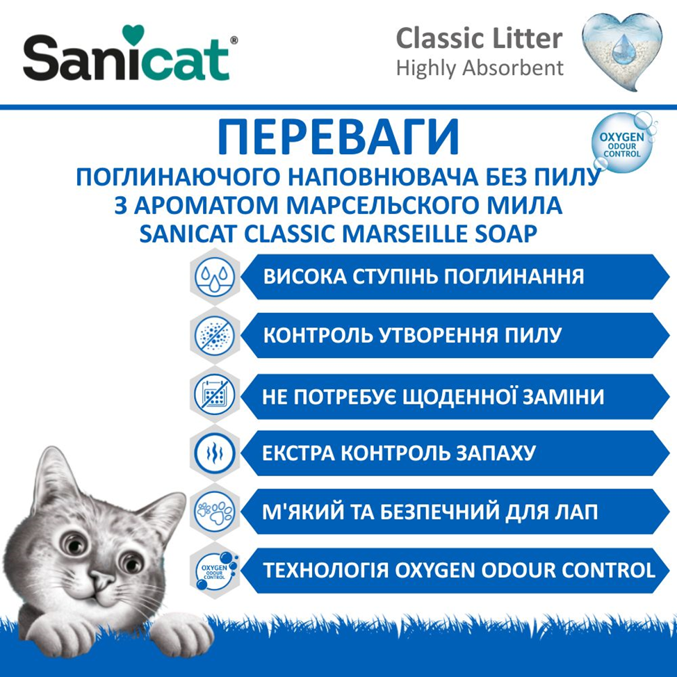 Мінеральний поглинаючий наповнювач для котів з ароматом марсельського мила Sanicat Classic Marseille Soap - це коли тривала чистота, комфорт і сучасні технології об’єднуються у кожній гранулі!