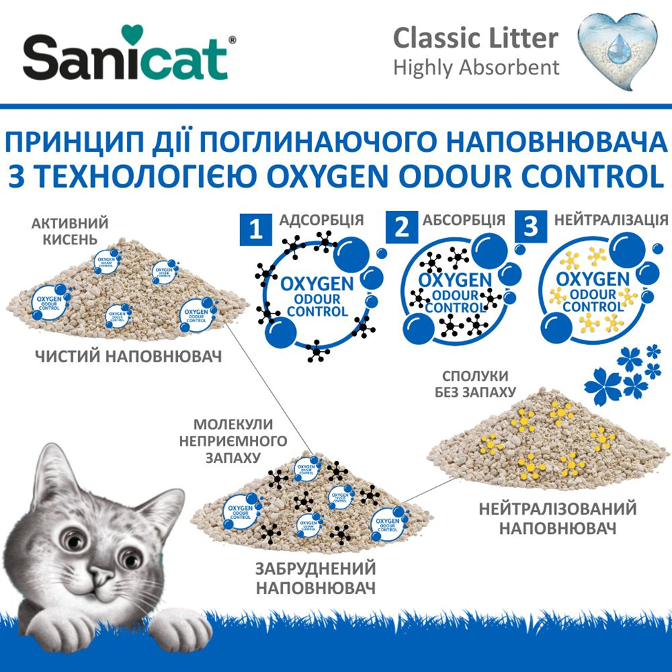 Механізм дії поглинаючого наповнювача для кота з технологією Oxygen Odour Control: