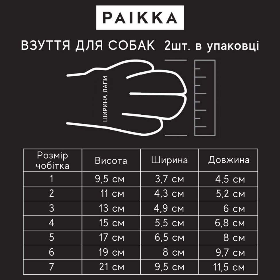 Для того щоб обрати потрібний розмір взуття для собак радимо скористатись наведеною таблицею розмірів. Звертаємо Вашу увагу, що ширина передніх та задніх лапок собаки може відрізнятись, саме тому PAIKKA пропонує лише два чобітки в упаковці, залишаючи за Вами ідеальний підбір розміру взуття для свого улюбленця на передні та задні лапки окремо, унеможливлюючи дискомфорт для Вашого друга.
