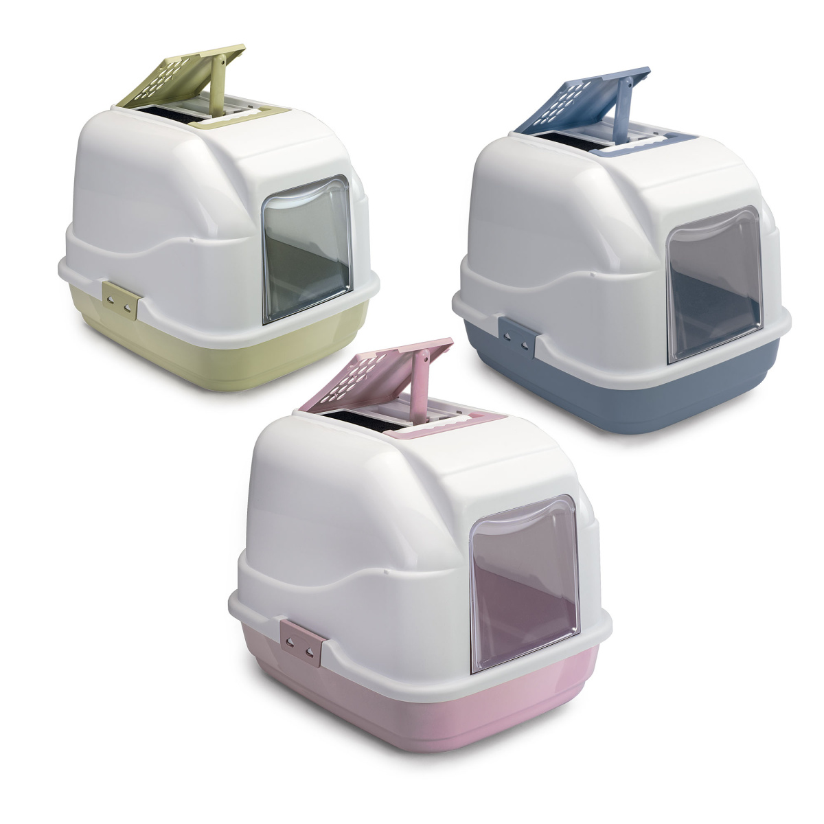 Відкидні дверцята. Прозорі дверцята забезпечують коту комфортний вхід і вихід, зменшують розповсюдження запахів та наповнювача, а також дозволяють легко контролювати стан лотка й за потреби швидко зняти дверцята для очищення.
