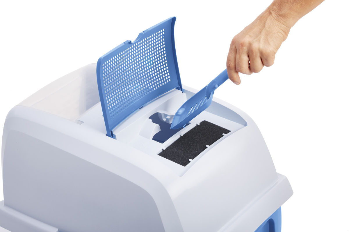 Змінний вугільний фільтр. Ефективно поглинає та нейтралізує неприємні запахи, не дозволяючи їм поширюватись по квартирі або будинку. Завдяки цьому закритий туалет для кота ідеально підходить для використання у ванній кімнаті, коридорі чи житловому просторі.