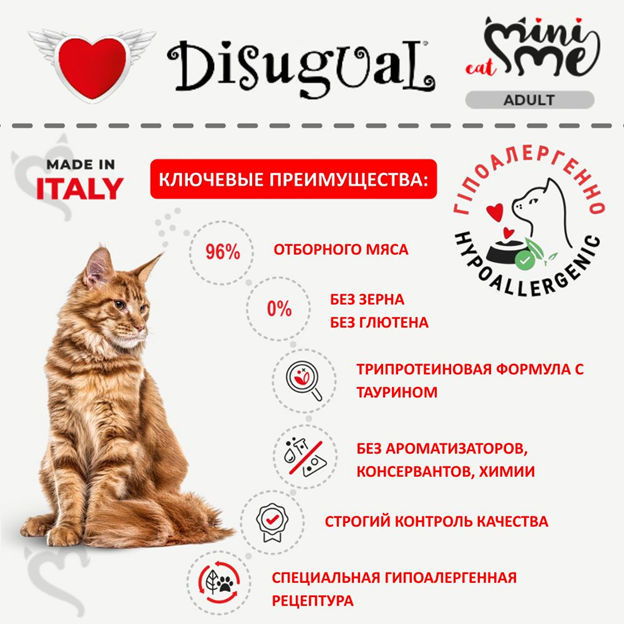 Специальная итальянская рецептура протеинового корма для котов Disugual Mini Me Cat 96% Protein Turkey без глютена и зерна на основе трех видов отборного мяса с витаминно-минеральным комплексом, таурином и естественным пребиотиком идеально подходит как полнорационный корм для котов с пищевой непереносимостью, пищевой аллергией у котов, непереносимостью глютена у котов, ожирение у котов, активных и привередливых кошек.