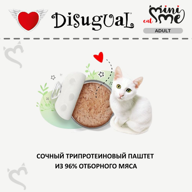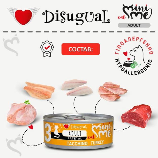 Disugual Mini Me Cat 96% Protein Turkey Безглютеновый консервированный беззерновой корм для котов Паштет из Индейки - это высококачественный натуральный влажный безглютеновый корм для котов класса холистик от итальянского бренда Disugual, известного производителя высококачественного натурального питания для собак и котов без добавления искусственных ароматизаторов, консервантов и других химических веществ.