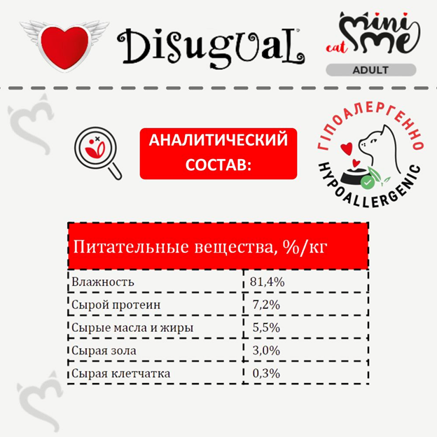 Disugual - это прозрачная маркировка каждого продукта. Безопасность вашего питомца на первом месте: на этикетках продуктов Disugual точно и исчерпывающе указан состав, ведь вы должны точно знать, что попадает в миску вашего питомца.