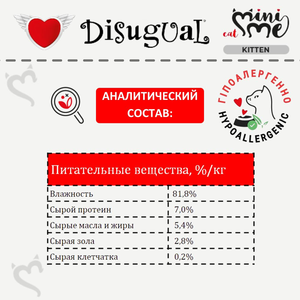 Состав беззернового гипоаллергенного паштета для котят Disugual Mini Me Kitten 96% Protein Chicken: курица (мясо, печень) 30%, лосось, говядина, рис, лососевое масло, минеральные вещества, ксилоза.