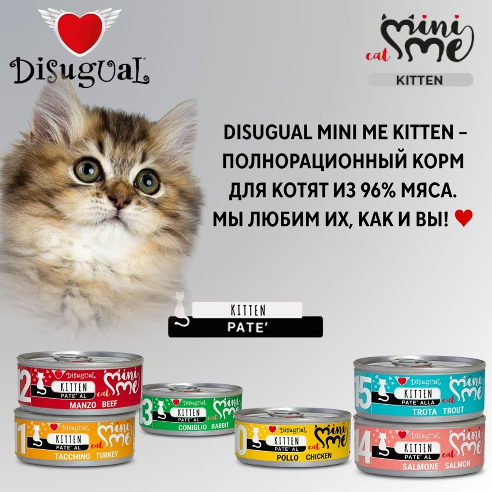 Линейка влажного безглютенового паштета для котят Disugual Mini Me Kitten 96% Protein - это натуральная еда для котят любых пород, изготовленная из отборного сырья и на 96% состоит из трех видов натурального мяса или рыбы, не содержит ароматизаторов, искусственных добавок и усилителей вкуса. Трипротеиновый паштет для котят - это сбалансированный рацион с уникальным сочетанием белков и жиров из разных видов мяса, который формирует здоровье и поддерживает активность и энергичность котят.