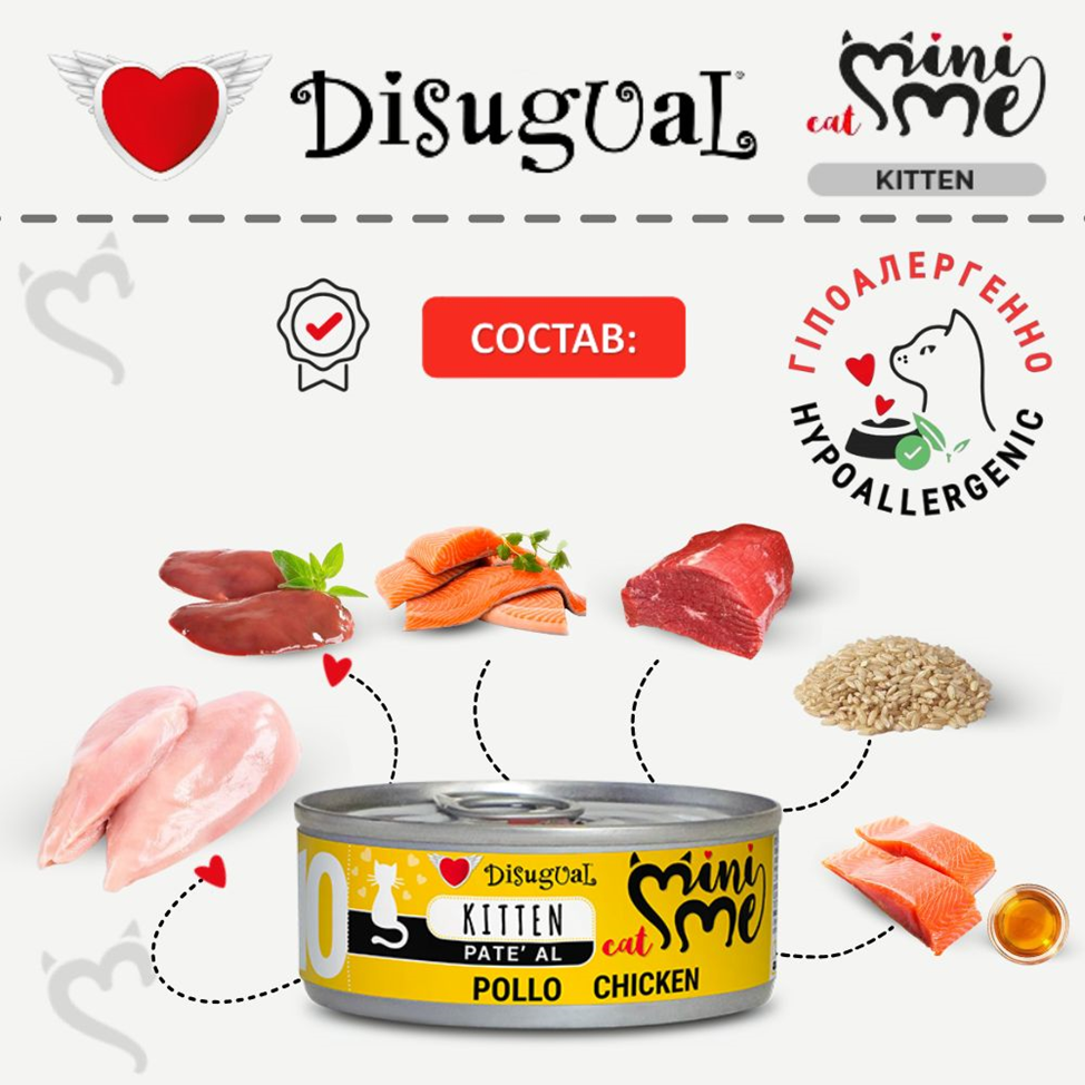 Disugual Mini Me Kitten 96% Protein Chicken Безглютеновый консервированный корм для котят Паштет из Курицы - это высококачественный натуральный влажный безглютеновый корм для котят класса холистик от итальянского бренда Disugual, известного производителя высококачественного натурального питания для собак и котов без добавления искусственных ароматизаторов, консервантов и других химических веществ.