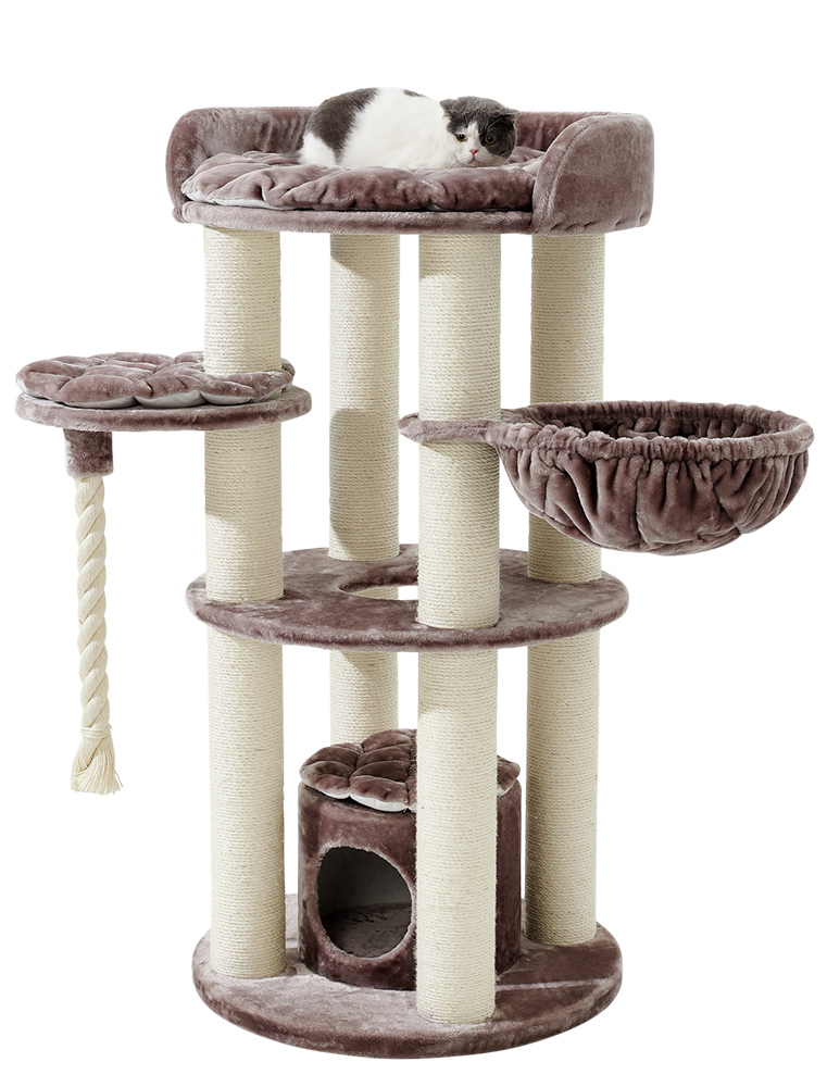 Когтеточка-многоуровневый игровой комплекс для кота имеет устойчивое круглое основание, которое с легкостью выдерживает активную игру, домик, гамак, лежак и верхние платформы для кошки обтянуты мягким плюшем и создают неповторимый уют, столбики-когтеточки изготовлены из сизаля и обеспечивают долговечность и эффективный уход за когтями.