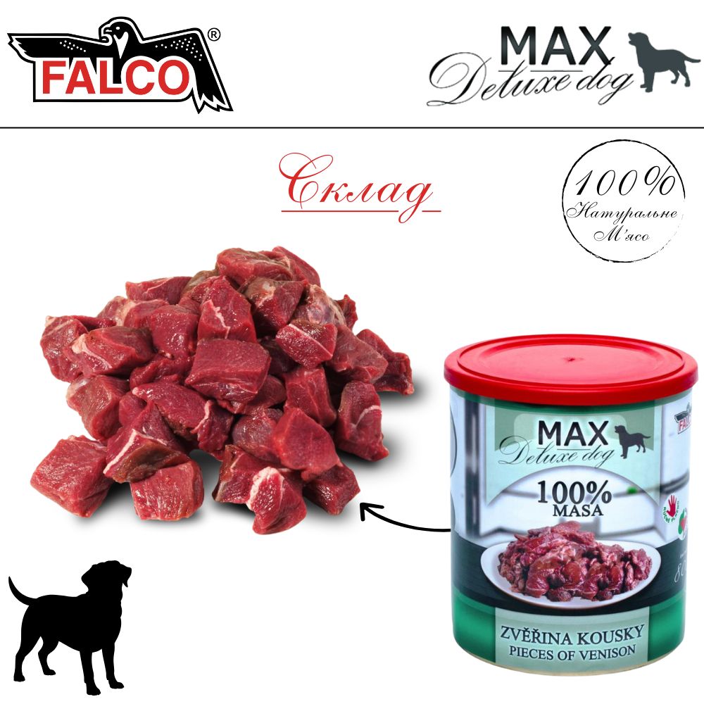 Ключевые преимущества консервированного мяса для собак Кусочки Оленины FALCO MAX Deluxe Dog 100% Meat Venison Pieces: