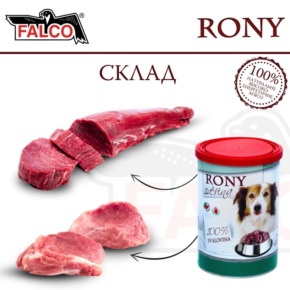 Состав консервированного мяса для собак с высокой энергетической ценностью Оленина FALCO RONY Dog 100% Meat Venison: оленина (40%), свинина (60%)