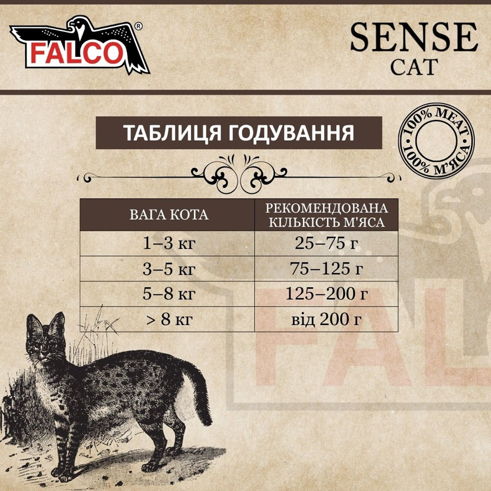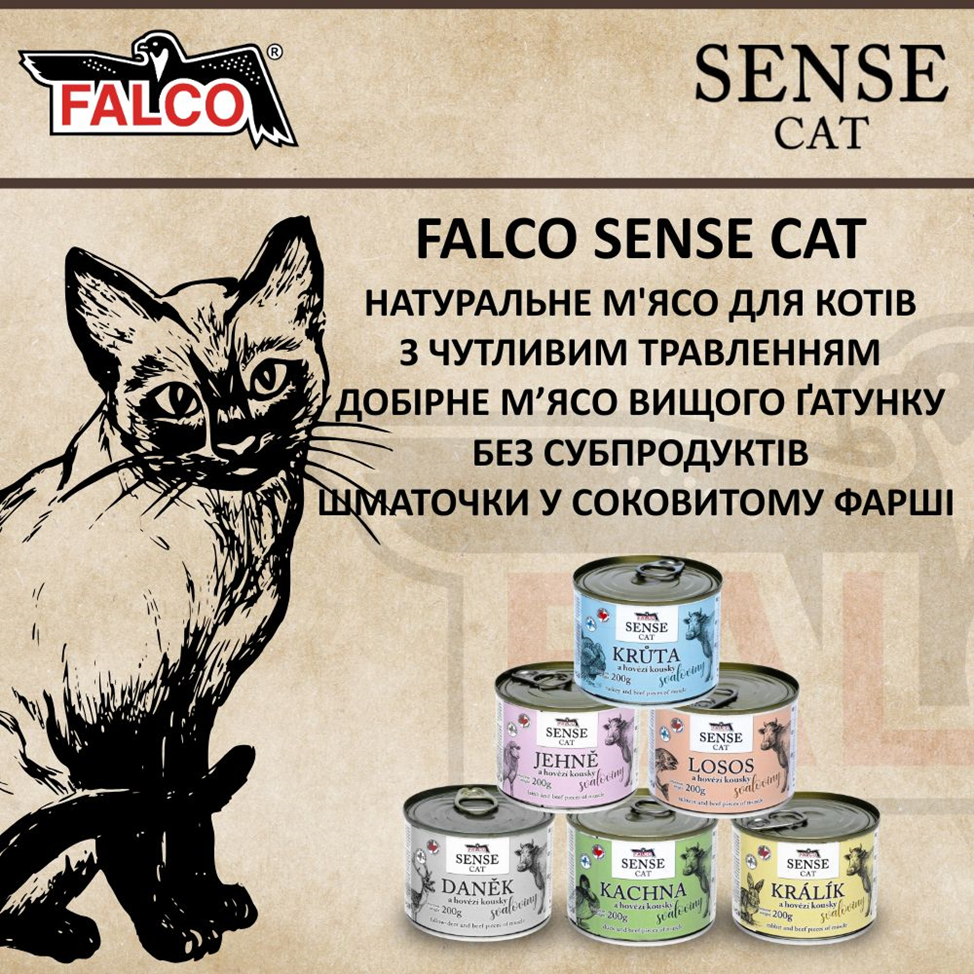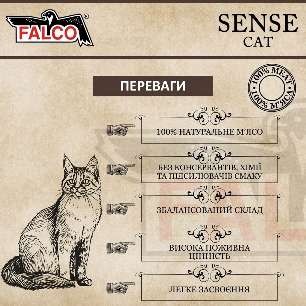 Для котов с чувствительным пищеварением каждый ингредиент имеет значение. Именно поэтому FALCO SENSE CAT создан из натурального мяса высшего сорта - без субпродуктов, консервантов и искусственных добавок. Это не просто еда, а ежедневный ритуал здоровья, легкости и удовольствия!
