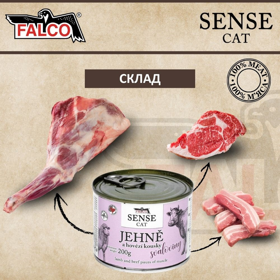 Ключевые преимущества консервированного мяса для котов с чувствительным пищеварением Ягненок с Говядиной FALCO SENSE CAT 100% Meat Lamb & Beef: