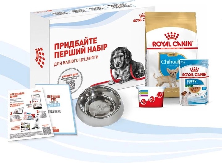 Перший набір: сухий корм 500 г, вологий корм 85 г, щоденник власника, мисочка, мірний стакан