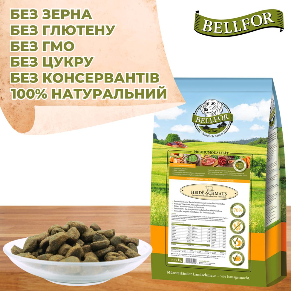 Уникальные ингредиенты в составе протеинового корма Bellfor Heide Schmaus не только обеспечивают организм собаки жизненно-необходимыми компонентами, но и предотвращают развитие распространенных болезней костей, суставов и связок и возрастных заболеваний глаз.