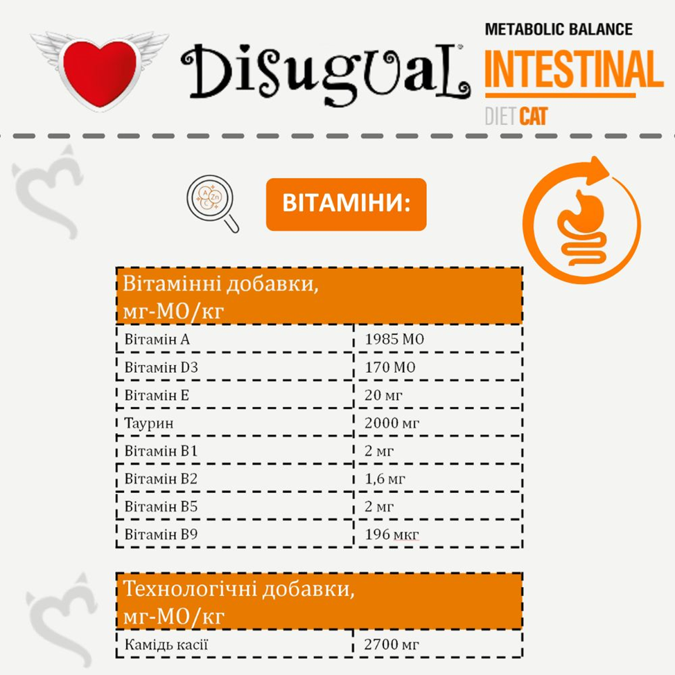 Состав лечебного корма интестинал для котов Disugual Metabolic Balance Diet Cat Intestinal Beef: говядина (печень, сердце) 45%, курица (мясо, печень), гидролизат индейки, лососевое масло, минеральные вещества, MOS, XOS, ксилоза.