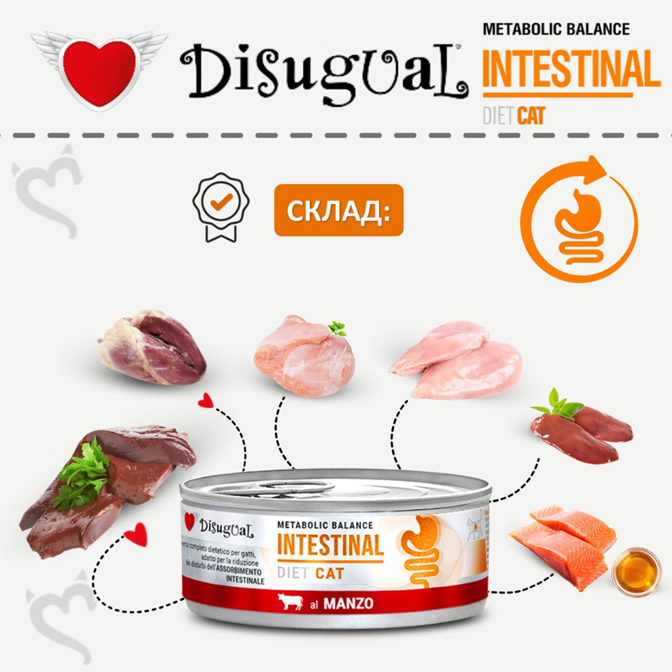 Disugual Metabolic Balance Diet Cat Intestinal Beef Влажный лечебный корм для котов при расстройствах пищеварения Паштет из Говядины - это высококачественный натуральный влажный безглютеновый лечебный корм для котов класса холистик от итальянского бренда Disugual, известного производителя высококачественного натурального питания для собак и котов без добавления искусственных ароматизаторов, консервантов и других химических веществ.