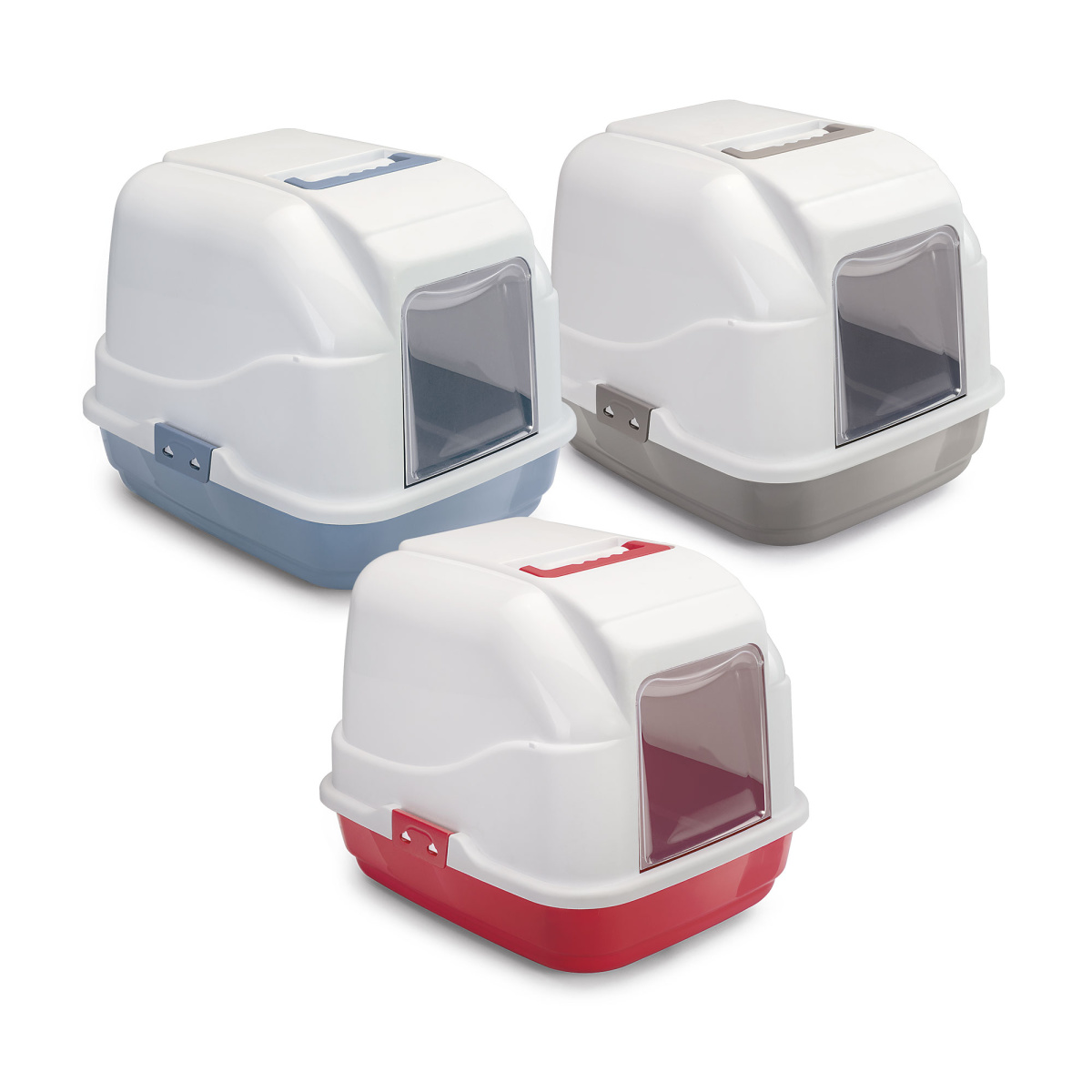 Откидные дверцы. Прозрачные дверцы обеспечивают коту комфортный вход и выход, уменьшают распространение запахов и наполнителя, а также позволяют легко контролировать состояние лотка.