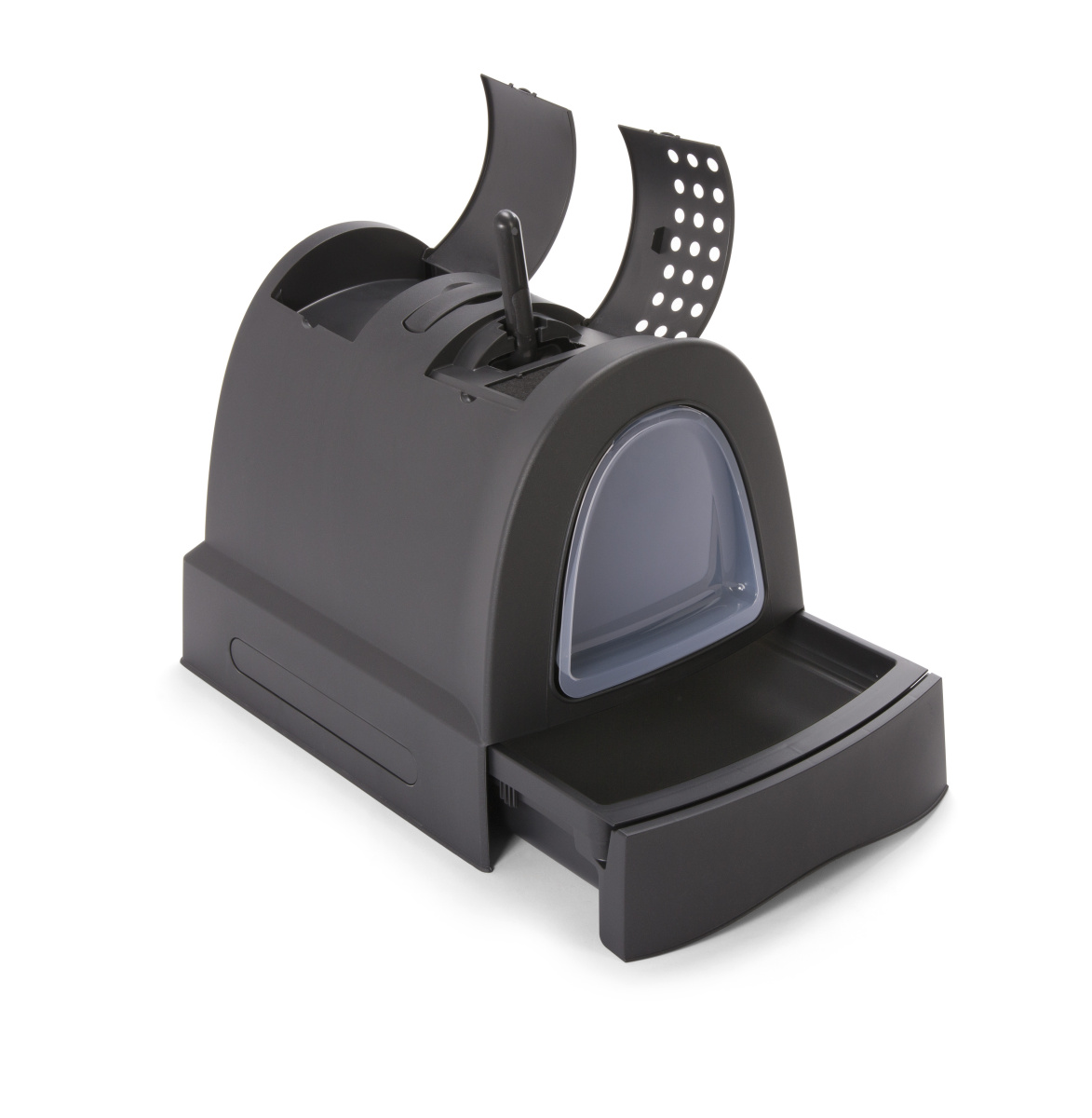 Сменный угольный фильтр. Эффективно поглощает и нейтрализует неприятные запахи, не позволяя им распространяться по квартире или дому. Благодаря этому закрытый туалет для кошки идеально подходит для использования в ванной комнате, коридоре или жилом пространстве.